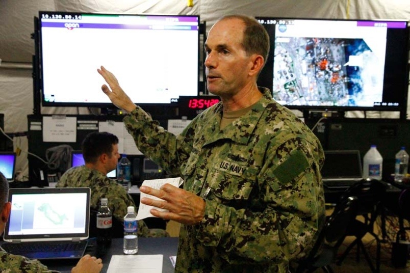 Chris Peterschmidt, một sĩ quan chỉ huy của Hải quân Mỹ, giải thích tầm quan trọng của hoạt động cứu hộ, ứng phó thiên tai. Đây là một trong những hoạt động không thể thiếu của cuộc tập trận RIMPAC, diễn ra hai năm một lần. |