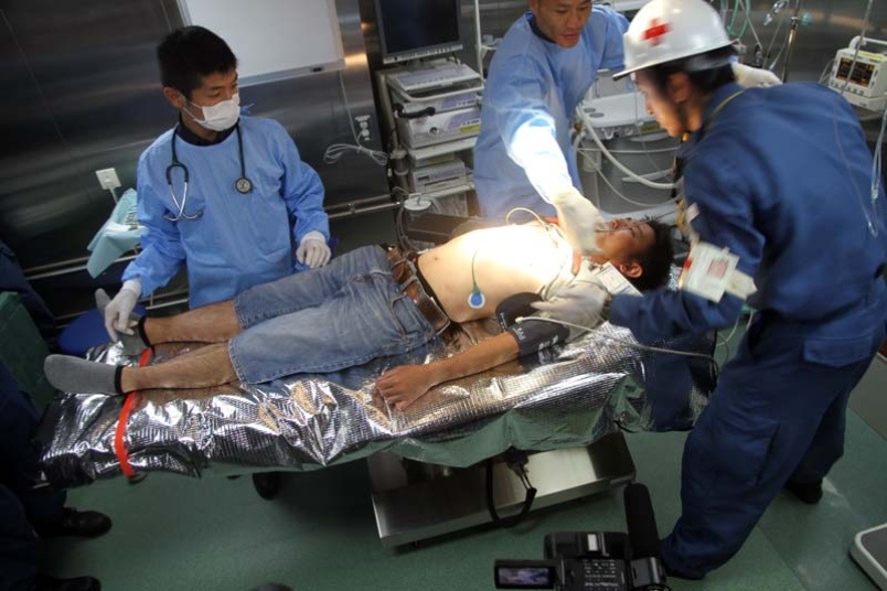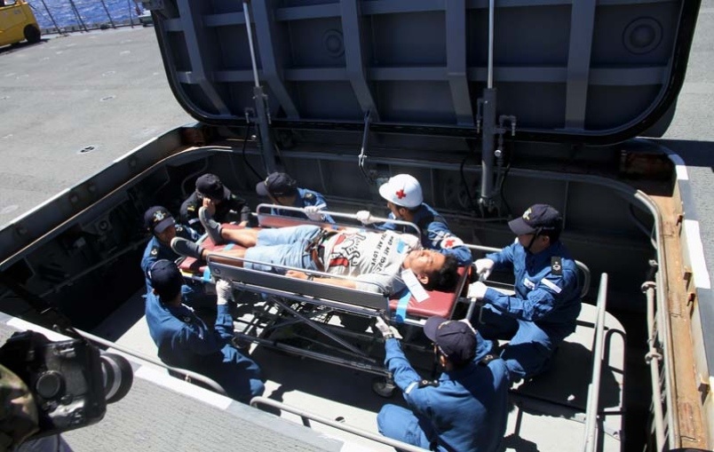 Bác sĩ trên tàu thực hiện các biện pháp cấp cứu cho nạn nhân. Phi đội trực thăng trên JS Ise cho phép nhân viên y tế đưa nhiều người lên tàu. |