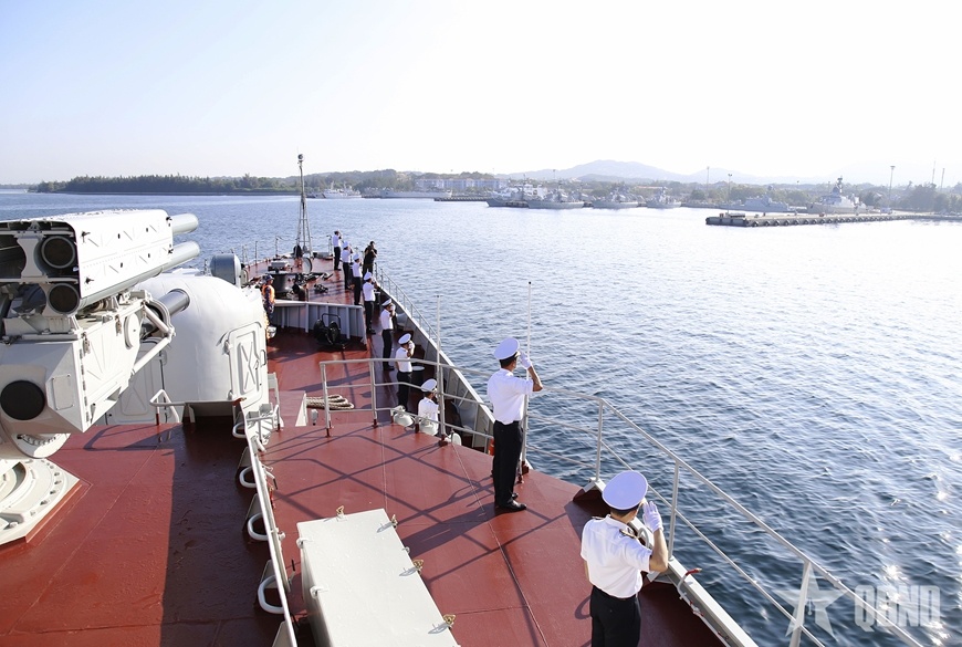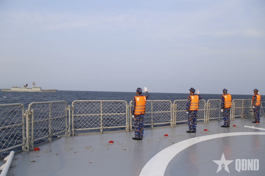 | Tàu Hải quân hai nước chào nhau trên biển sau khi hoàn thành nhiệm vụ tuần tra, huấn luyện liên hợp trên vùng biển Vịnh Bắc Bộ. |