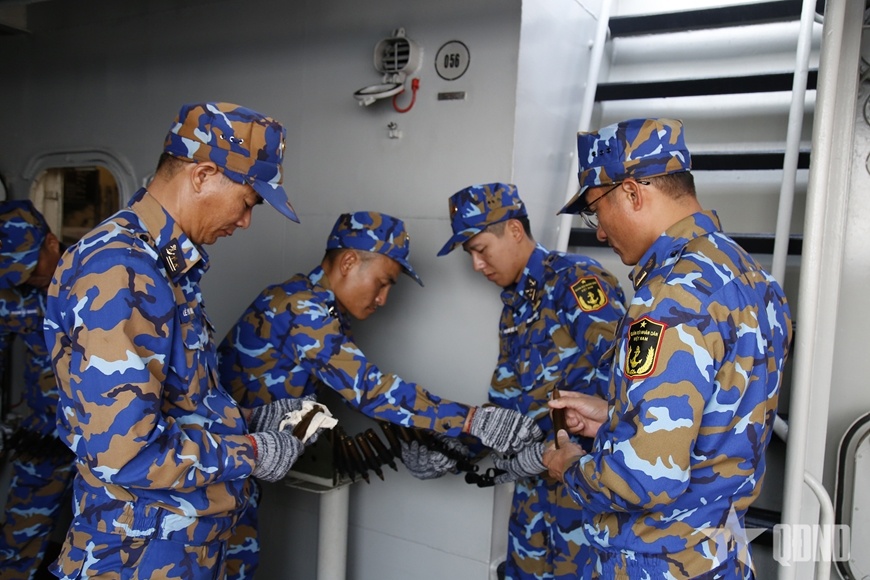 | Cán bộ, chiến sĩ Tàu 015 chuẩn bị vũ khí, trang bị cho nội dung bắn đạn thật chống cướp biển. |
