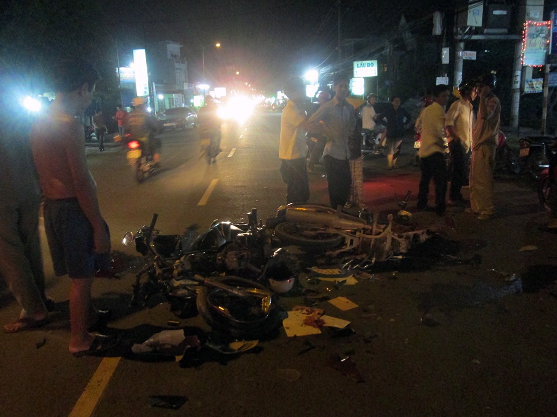 Khi đến địa điểm trên, xe anh Chung tông trực diện xe máy biển số 60M5 do một thanh niên (chưa rõ tên tuổi) điều khiển chạy ngược chiều.