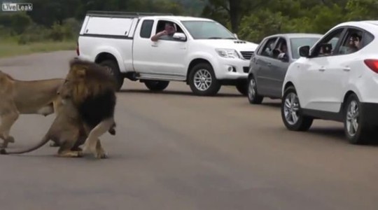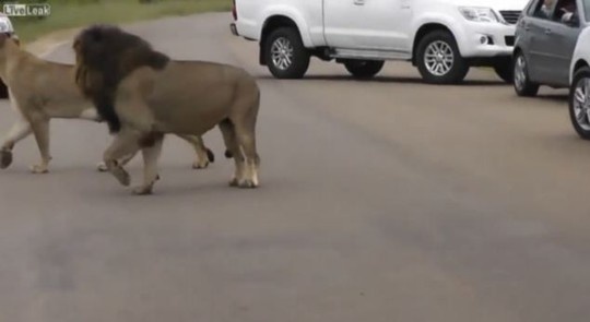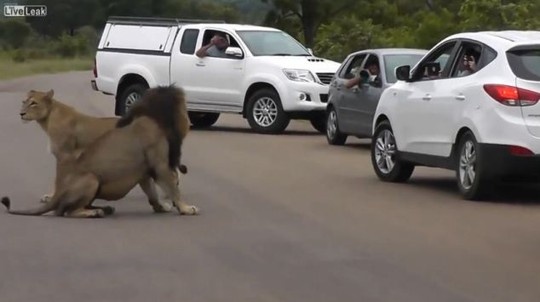Một cặp sư tử trong Công viên Quốc gia Kruger, Nam Phi mon men đến gần những chiếc ô tô của khách tham quan. Trong lúc đó, 2 đứa trẻ thò đầu ra khỏi cửa sổ để chụp ảnh.