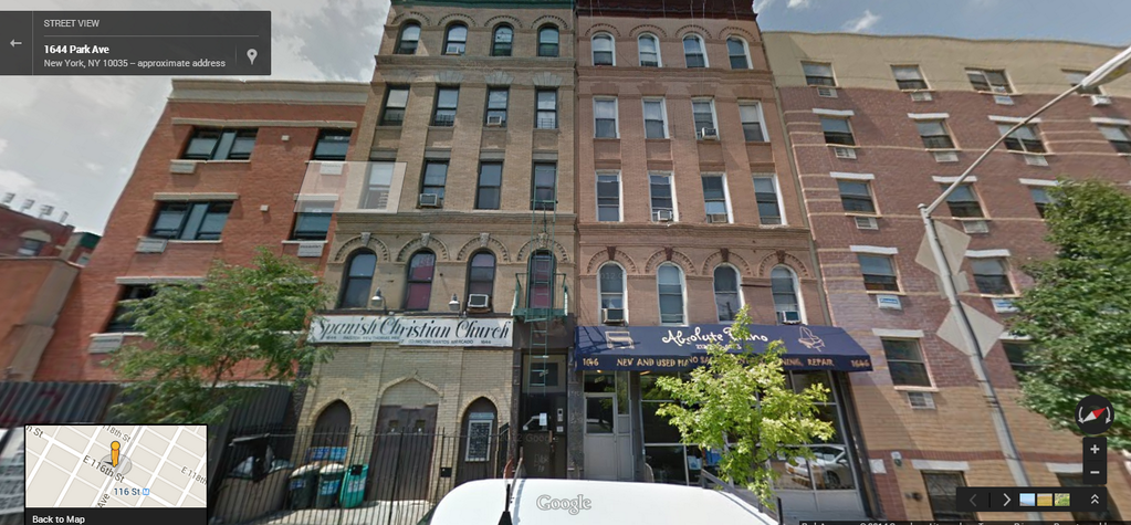 | Một bức ảnh về hai tòa nhà 5 tầng (ở giữa) trên đường 116, New York trước khi chúng sập. Ảnh: Google Map |