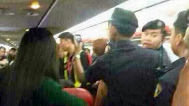 Sự cố xảy ra trên máy bay AirAsia của Thái Lan khiến phi cơ phải quay đầu trở lại Bangkok khi đang trên đường tới Nam Ninh, Trung Quốc. Lực lượng an ninh đã có mặt trên máy bay để đưa 4 hành khách này xuống mặt đất. Ảnh: CEN |