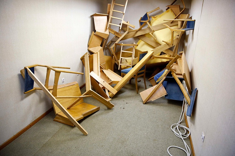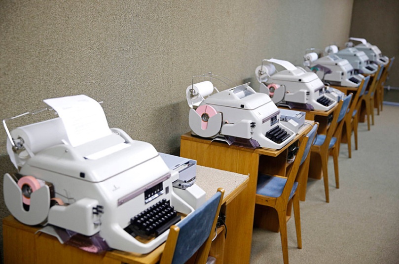 | Văn phòng dành cho các cuộc họp nhỏ cùng những chiếc điện thoại cũ màu đỏ đặt ngay ngắn trên bàn. |