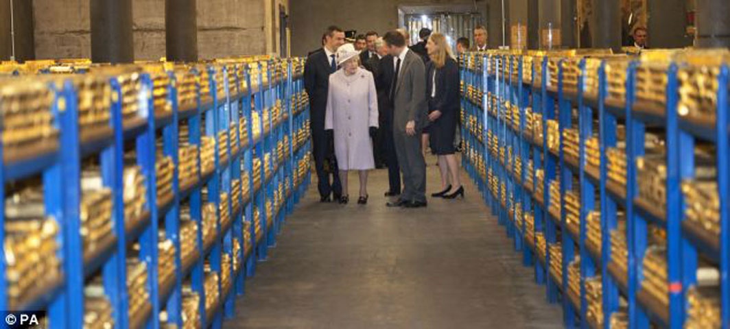 Nữ hoàng Elizabeth và Công tước xứ Edingburgh thăm quan kho vàng lớn nhất nước Anh, nơi chứa 4.600 tấn vàng vào hồi năm ngoái.