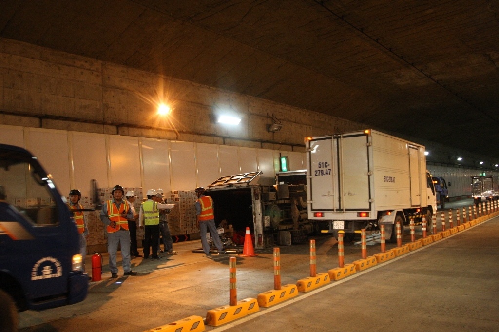 | Hiện trường vụ lật xe trong hầm. Vụ việc được lực lượng CSGT Bến Thành cùng nhân viên của Ban quản lý hầm nhanh chóng đến giải quyết. |