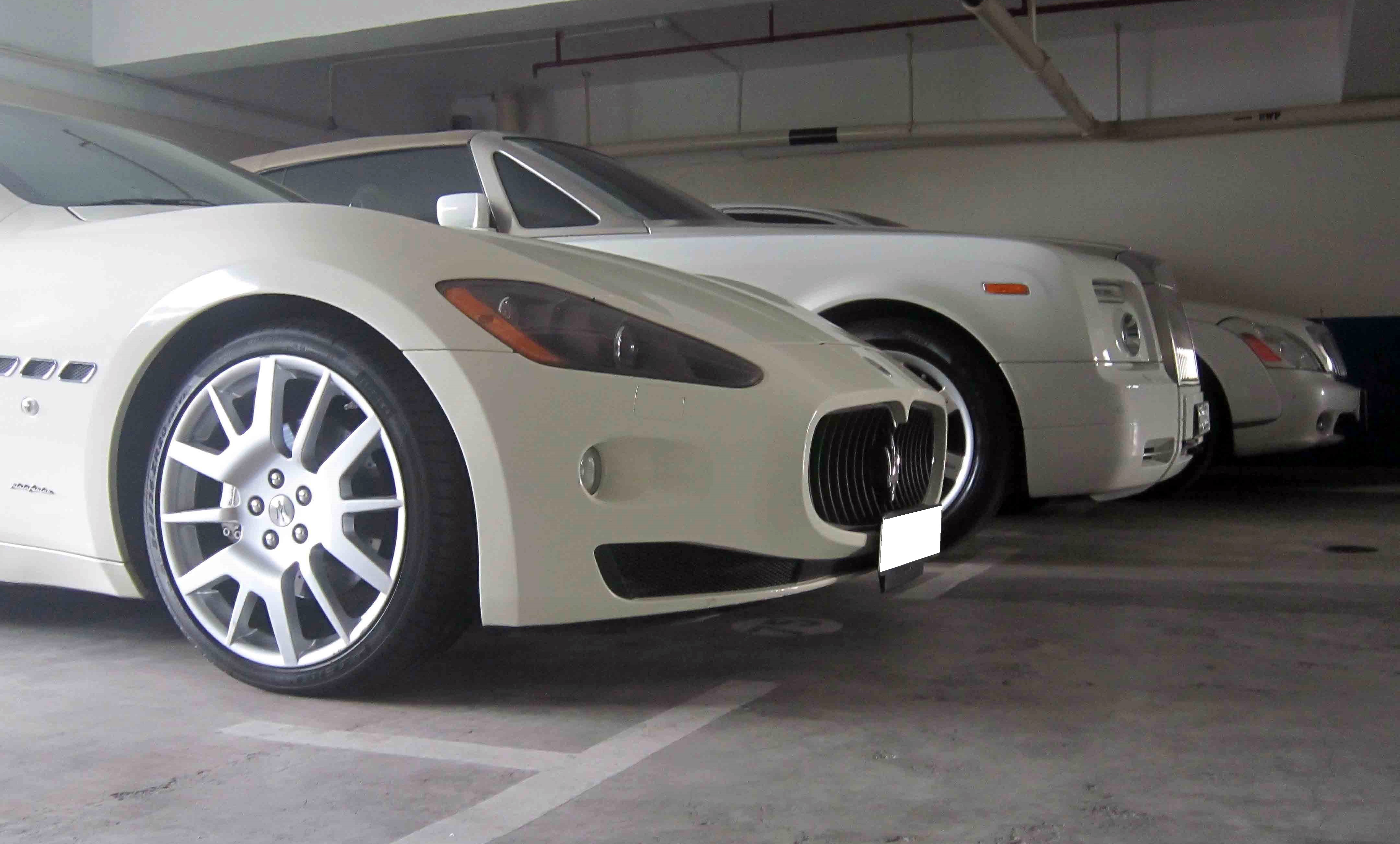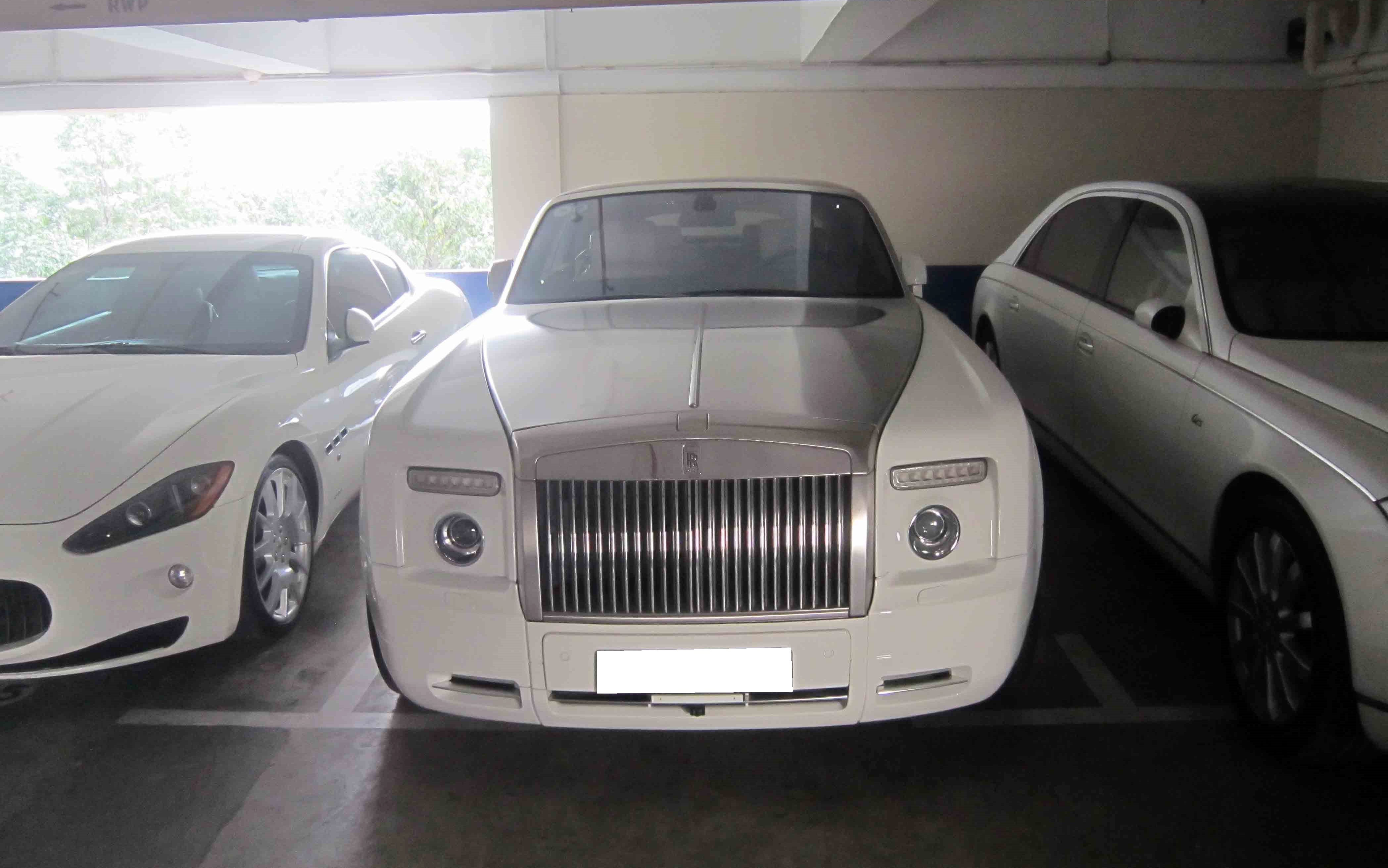 | Bộ ba xe siêu sang, từ phải qua là Maybach 62S, Rolls-Royce Phantom Drophead Coupe, Maserati Granturismo. Cả ba chiếc xe đều có màu trắng. |
