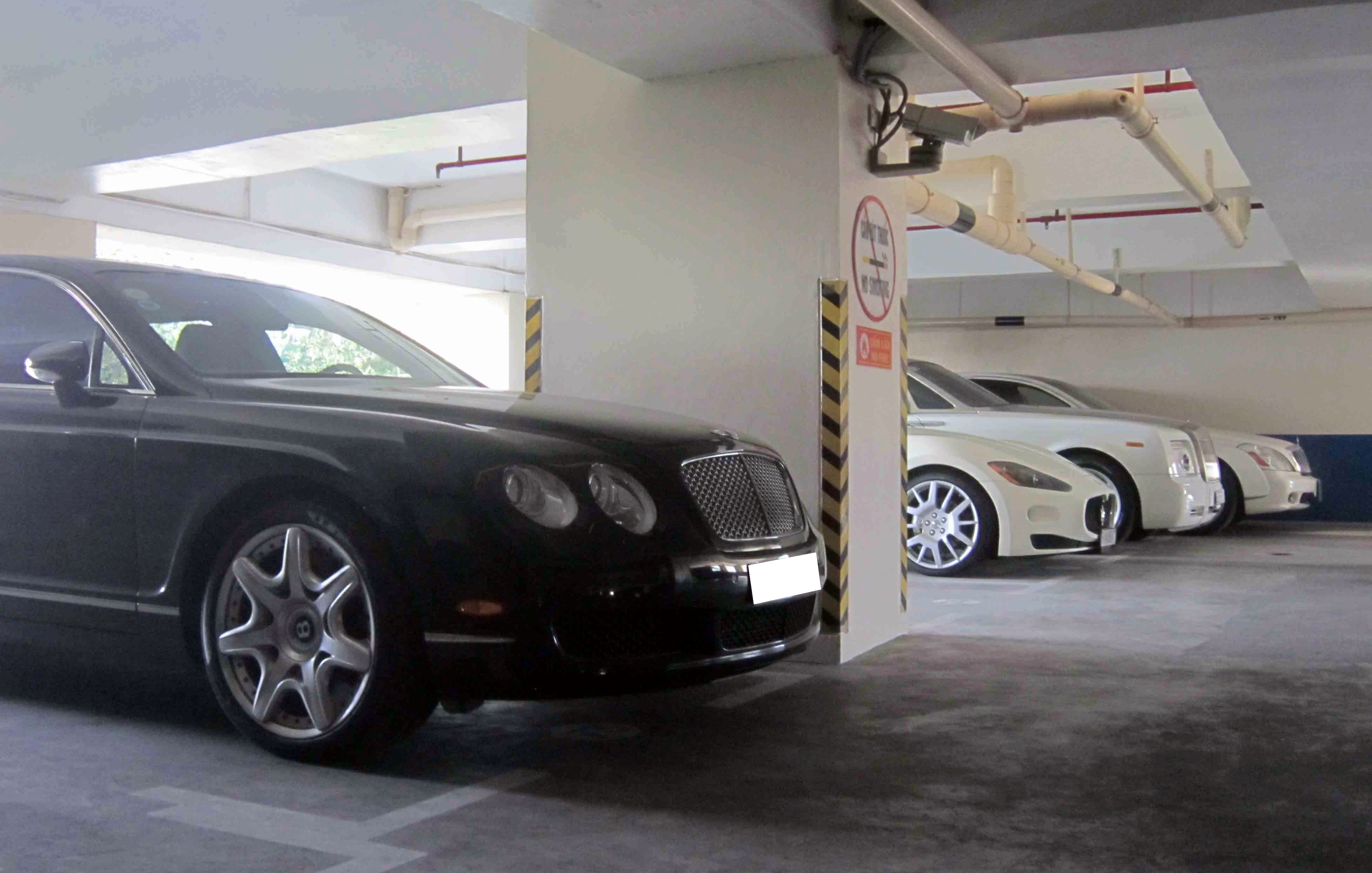 5 chiếc xe siêu sang bao gồm Rolls-Royce, Maybach, Maserati và 2 chiếc Bentley cùng xuất hiện trong một hầm để xe của khách sạn trung tâm Sài Gòn.