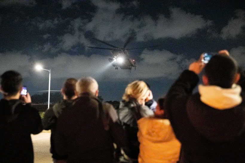 Trực thăng chở 3 con tin Israel được Hamas trao trả về tới Ramat Gan, Israel. Ảnh: THX/TTXVN. |