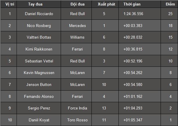 | Hưởng lợi lớn từ cú va chạm của hai tay đua Mercedes, Daniel Ricciardo dễ dàng duy trì vị trí dẫn đầu và là người cán đích đầu tiên sau 1 giờ 24 phút 36,556 giây. |
