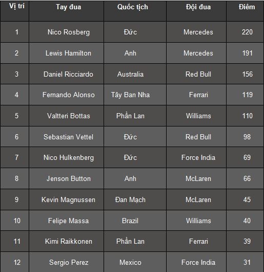 | Dù chỉ có được vị trí thứ 2 nhưng với 20 điểm giành được tại Belgium GP, Rosberg tạm thời bỏ xa đồng đội Hamilton tới 29 điểm trên BXH tổng. Tuy nhiên, mùa giải 2014 vẫn còn tới 7 chặng đua ở phía trước. |