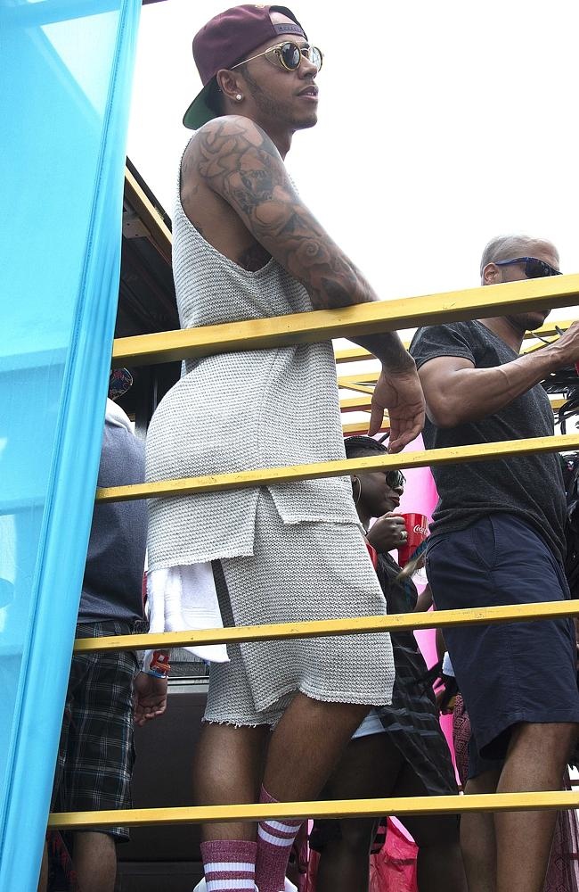 Trái với sự cuồng nhiệt của Rihanna, Lewis Hamilton cũng có mặt nhưng chỉ lặng lẽ đứng từ xa ngắm nhìn người đẹp và tận hưởng bầu không khí lễ hội. Như để đánh lạc hướng dư luận, Hamilton tham gia lễ hội cùng vài người bạn.