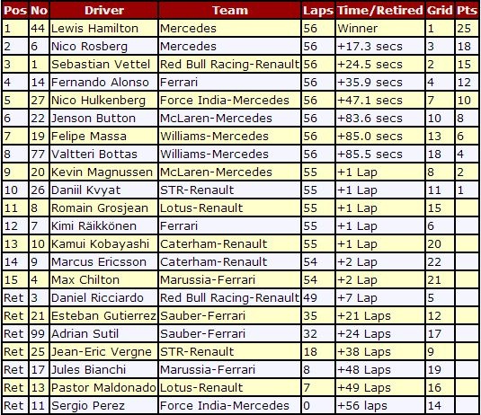 Kể từ đây, sức mạnh đáng nể của chiến mã F1 W05 cùng sự hỗ trợ từ người đồng đội Nico Rosberg, “viên ngọc đen” người Anh liên tục lập “fastest lap” để bỏ xa nhóm bám đuổi. Thậm chí có lúc, tay đua của Mercedes cách người xếp sau tới hơn 30 giây. Với quá nhiều lợi thế như vậy, không ngạc nhiên khi Hamilton là người cán đích đầu tiên sau 1 giờ 40 phút 25,974 giây.