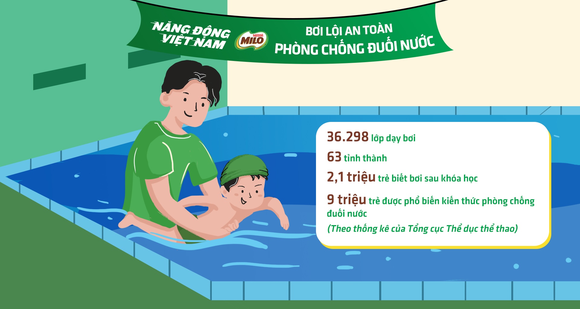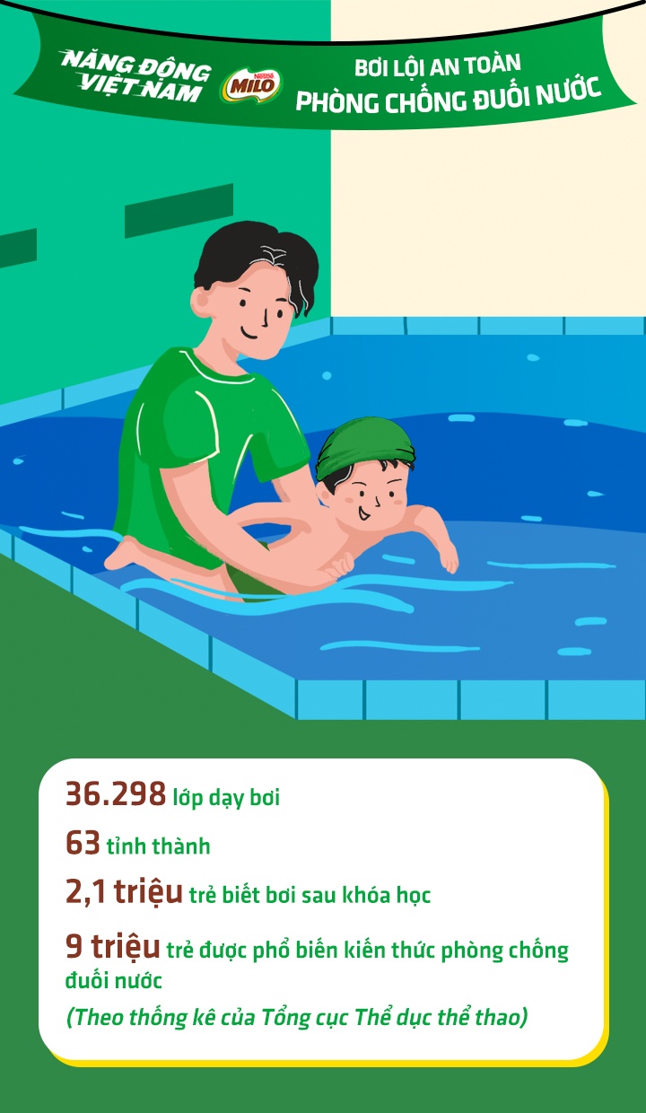 Tuy nhiên, việc dạy bơi an toàn, phòng chống đuối nước ở trẻ em là một hành trình dài, cần sự đồng lòng thực hiện của toàn thể xã hội. Mong muốn đồng hành xuyên suốt trên hành trình đó, từ năm 2017, Nestlé Milo - thương hiệu không ngừng nỗ lực khuyến khích trẻ em lớn lên cùng thể thao đã cùng chính quyền các cấp đưa chương Bơi an toàn, phòng chống đuối nước ở trẻ em đến nhiều địa phương trên cả nước thông qua nhiều hoạt động thiết thực.