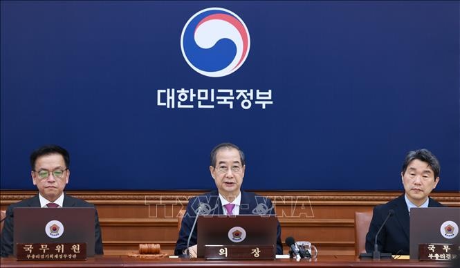 Quyền Tổng thống Hàn Quốc Han Duck-soo (giữa) chủ trì cuộc họp nội các về bầu cử tại Seoul ngày 8/4/2025. Ảnh: YONHAP/TTXVN. |