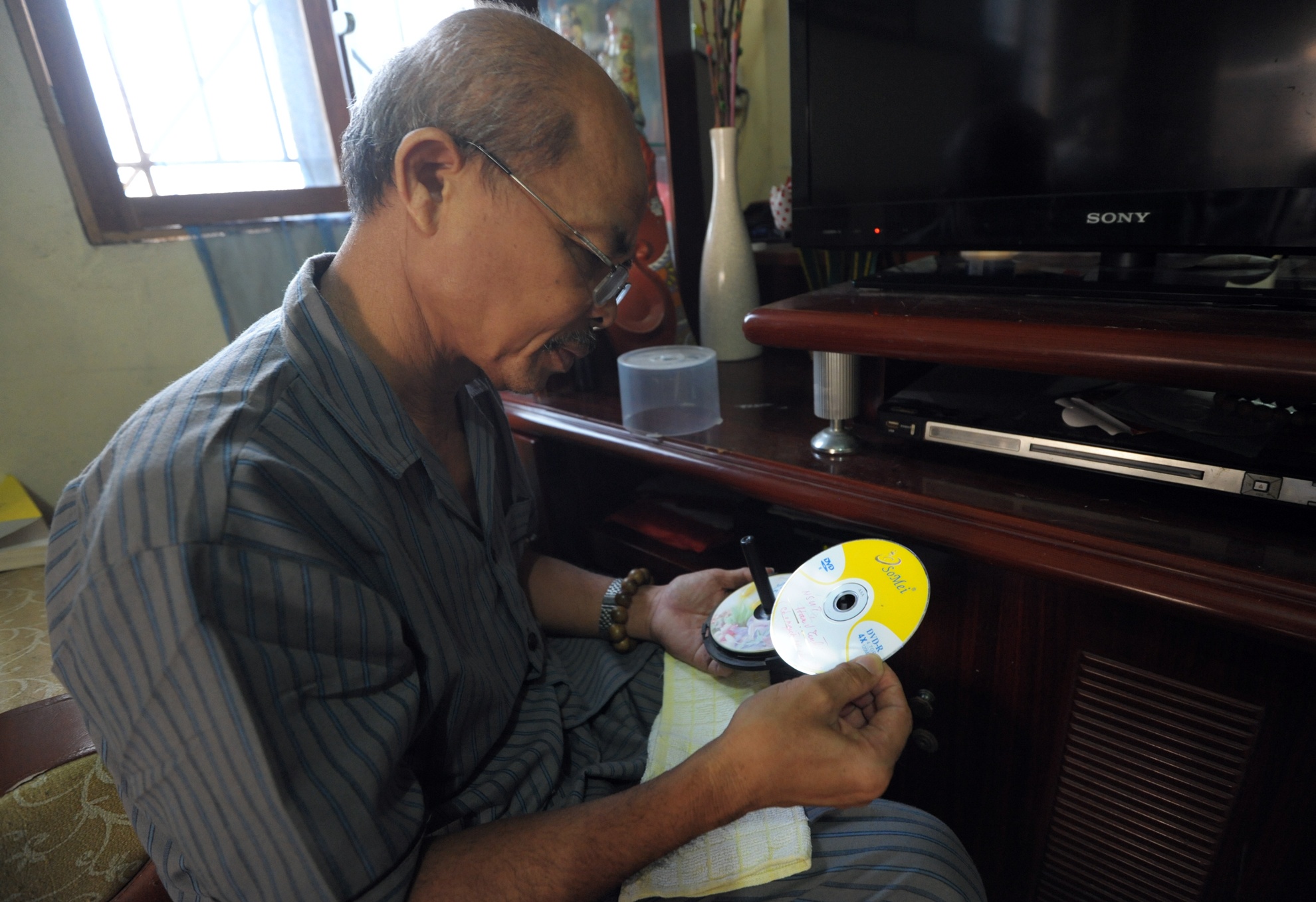 | Thỉnh thoảng, người nghệ sĩ lau chùi tủ bàn, ti vi, đầu đĩa và xem lại những thước phim đẹp trong suốt chặng đường hoạt động nghệ thuật. |