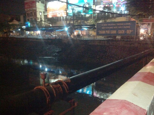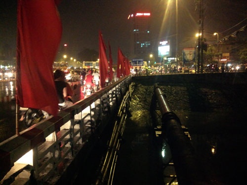 | Cô gái trèo lên đoạn ống nước bắc ngang sông Tô Lịch. |