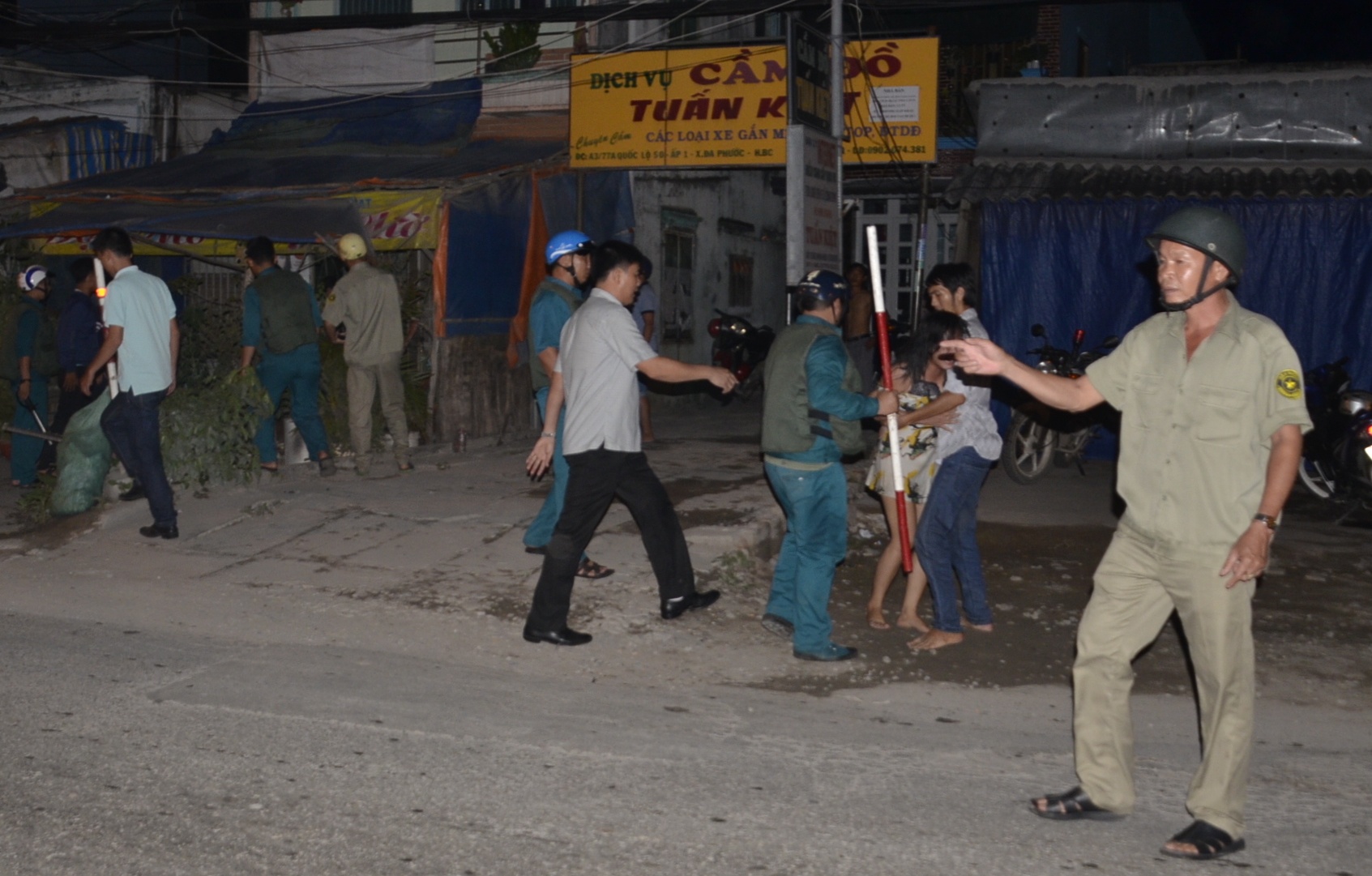 | Hàng chục cảnh sát khống chế đưa thanh niên về trụ sở công an. Ảnh: Khánh Trung. |