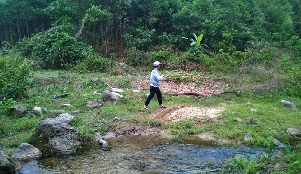 | Cảnh sát mặc thường phục truy lùng tên trộm trốn giữa rừng ở gần khu vực suối Mơ, xã Nghĩa Thuận(huyện Tư Nghĩa). Ảnh: C.A. |
