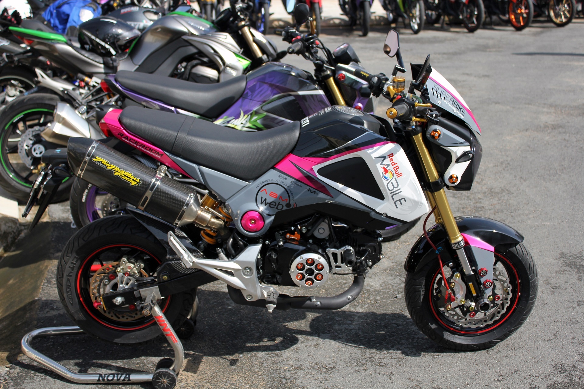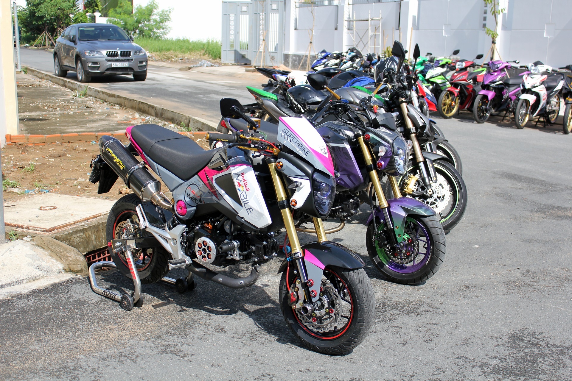 | Nổi bật trong "rừng" xe độ là cặp đôi Honda MSX được độ nhiều phụ tùng hàng hiệu và một số mô tô phân khối lớn. |