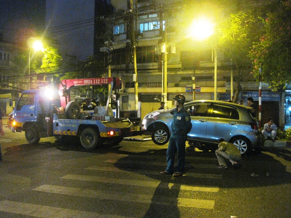 Chạy lùi được vài mét đến phần vạch trắng dành cho người đi bộ, chiếc ô tô tông vào một cô gái (gần 20 tuổi) đang đi xe đạp qua đường và cuốn cả người lẫn xe vào gầm. Chỉ đến khi leo lên dải phân cách giữa hai chiều đường Hoàng Diệu, xe mới dừng lại được.