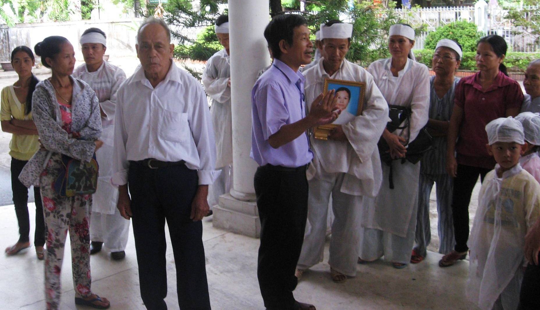 | Người nhà sản phụ mặc áo tang ngồi trước cửa Sở Y tế Thừa Thiên - Huế. |