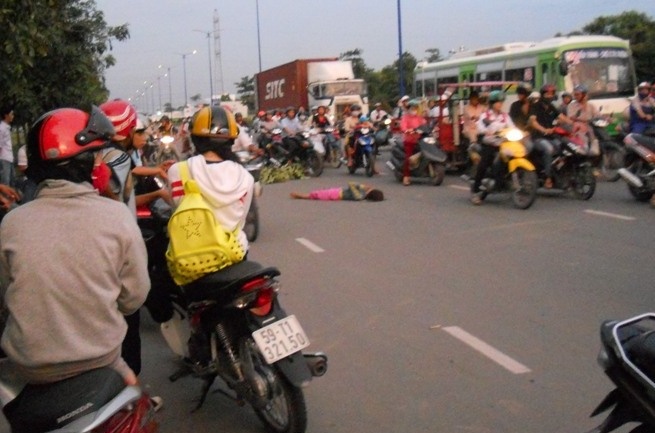 Nhiều người dân xung quanh thấy vụ việc đã ra khuyên can, định đưa vào lề đường nhưng chị nhất quyết không chịu. Đến 17h45, người phụ nữ bất ngờ nằm dài ra giữa đường cho… xe tải cán chết. Chờ lâu không thấy xe tải qua, chị đứng dậy nói đi đón xe lớn để “đâm đầu vào cho chết” khiến mọi người vất vả can ngăn.