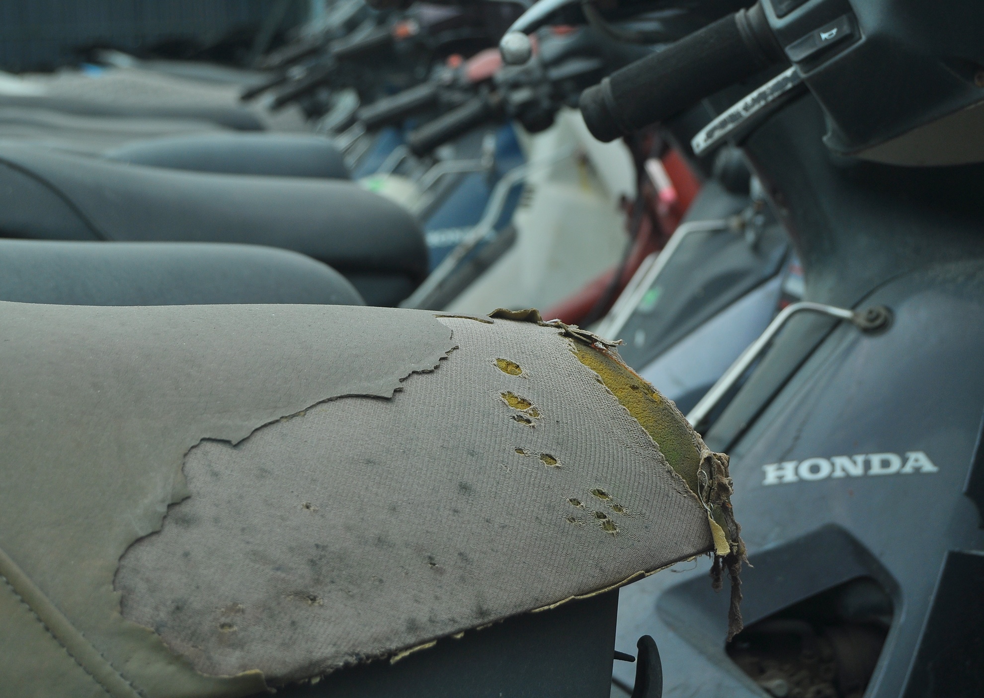 Yên ngồi trước một xe tay ga bị hư hỏng do mưa, nắng.