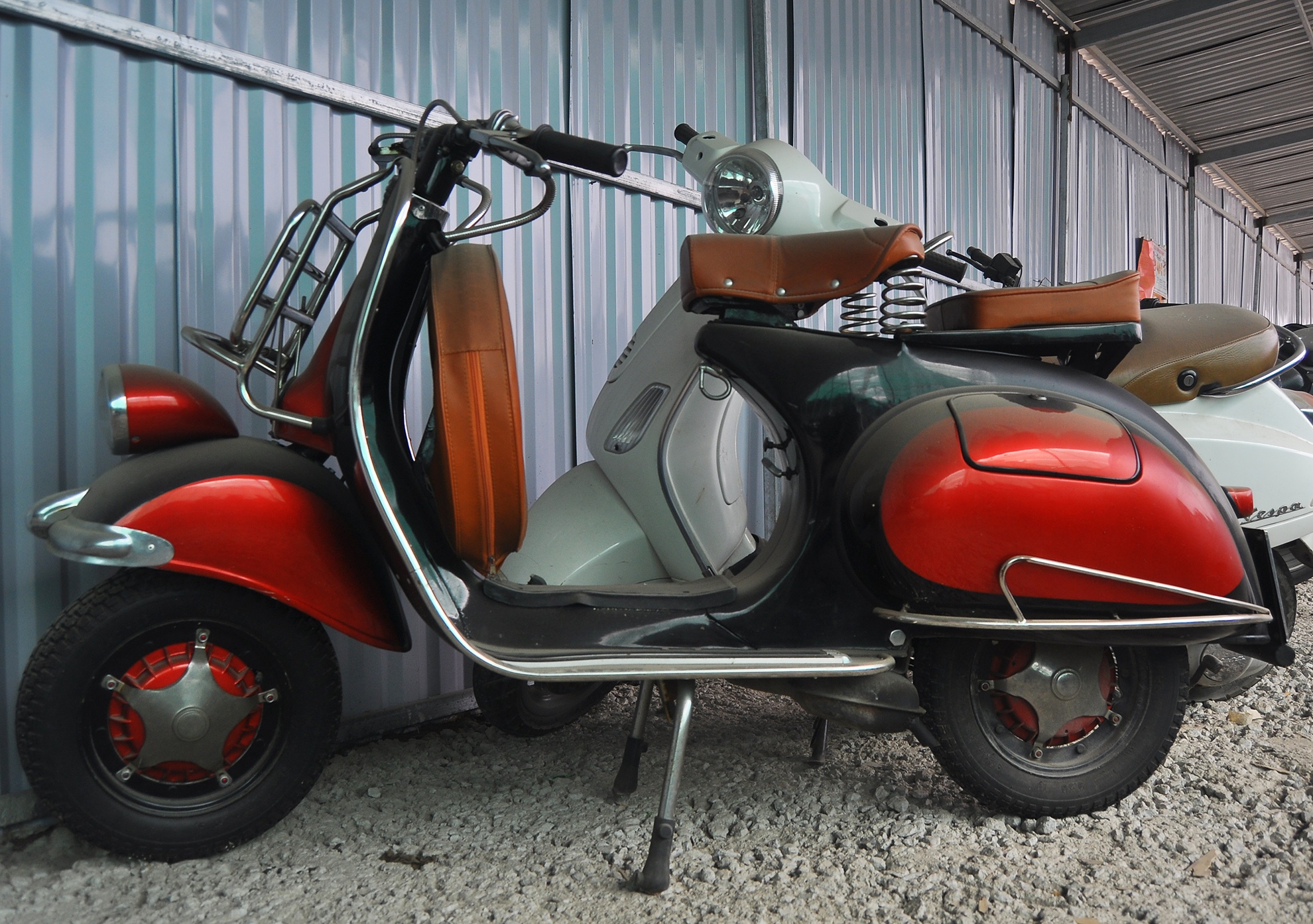| Chiếc Vespa hiếm gặp được phục chế xuất hiện bên cạnh những chiếc xe cùng hãng đời sau. |