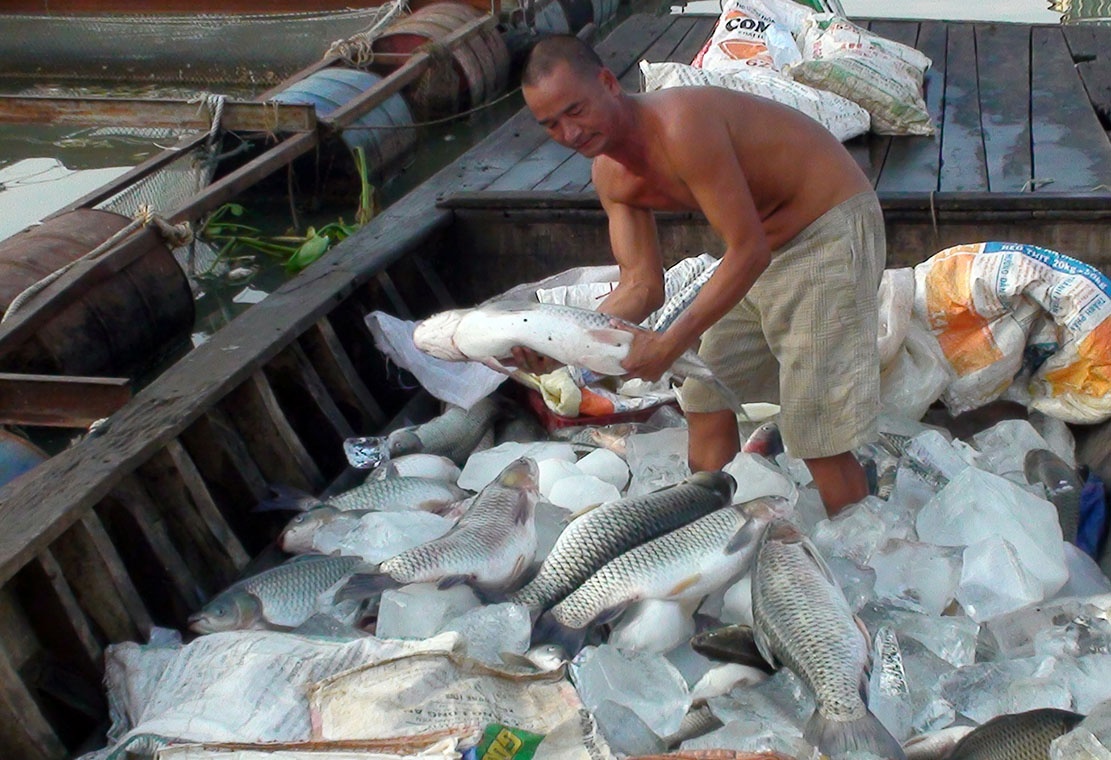 | Một ngư dân chọn những con cá mới chết để ướp đá làm thực phẩm. Ảnh: K.T. |