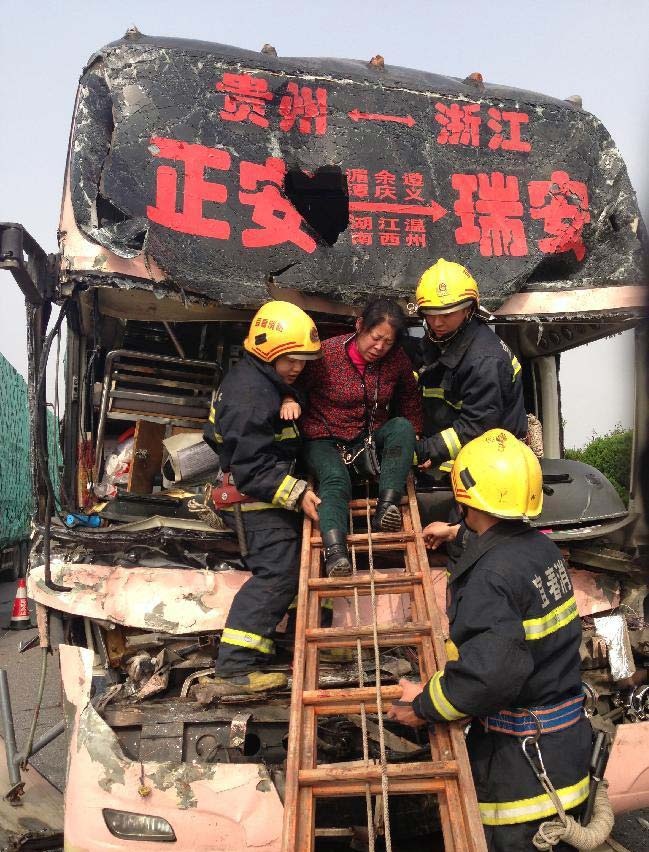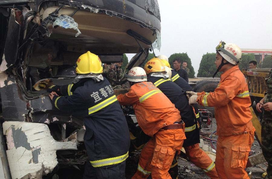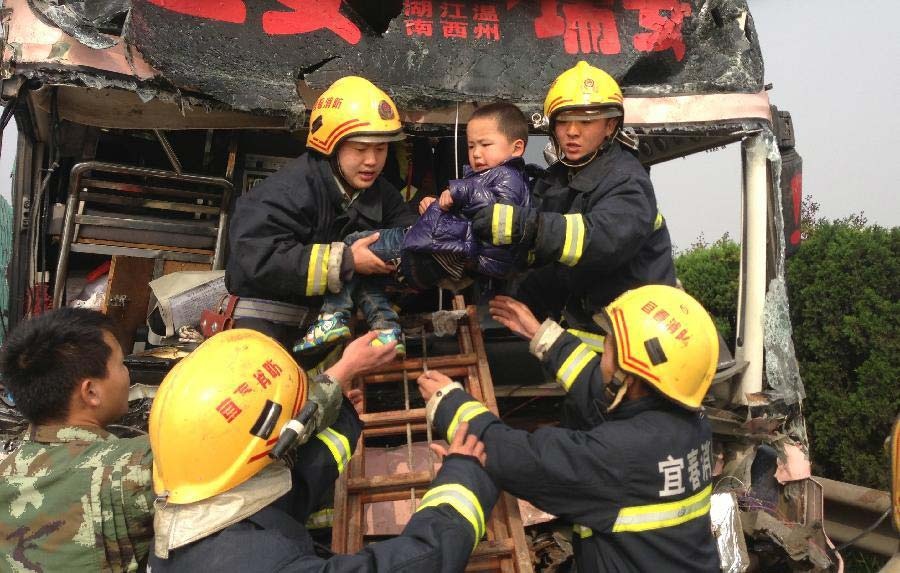 Lực lượng cứu hộ đang giải cứu một bé trai kẹt trong xe. Theo Tân Hoa Xã, vụ tai nạn xảy ra trên đường cao tốc Hukun, nối Thượng Hải với Côn Minh tại tỉnh Giang Tây. Ảnh: Tân Hoa Xã.