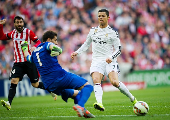 22': Thủ môn Iraizoz băng ra kịp thời, cản phá bóng trước khi Cristiano Ronaldo tung ra cú sút ngay sát mép vòng cấm của Bilbao.