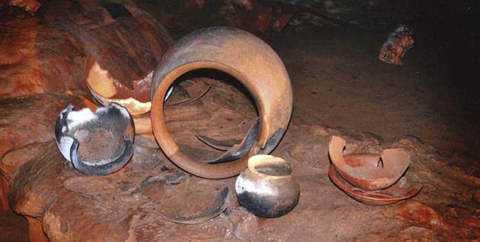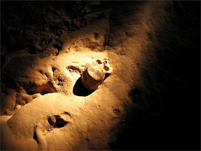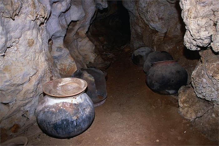 | Qua các cuộc khai quật khảo cổ, giới khoa học phát hiện nhiều chum sành là vật dụng đựng đồ hiến tế. Những bộ xương đã hóa đá, chìm trong nhũ thạch, hoặc nằm sâu dưới nền hang. |