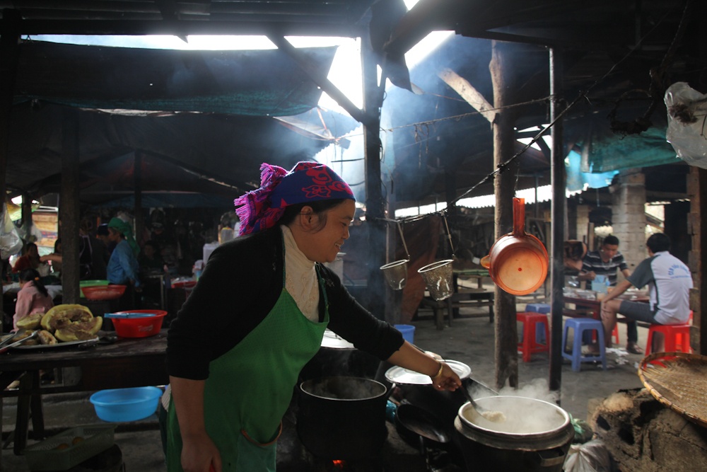 | Chị Già, một người bán rượu ở đây, chỉ trong buổi chợ phiền từ 5h sáng đến 12h trưa là bình rượu 50 - 60 lít của chị trống trơn. Chỉ vài tiếng bán rượu buổi sáng, chị Già có lời khoảng 500.000 đồng. Theo câu chuyện của chị Già, trước kia chị có bán thịt lợn đen, nhưng lời lãi không nhiều, thường xuyên bị ế và hỏng do không biết cách bảo quản. Ngược lại, bán rượu rất chạy, lại nhàn nhã. Cả phiên chợ, chị Già chỉ ngồi đong rượu bán mà vừa có thể chăm 3 đứa con nhỏ. |