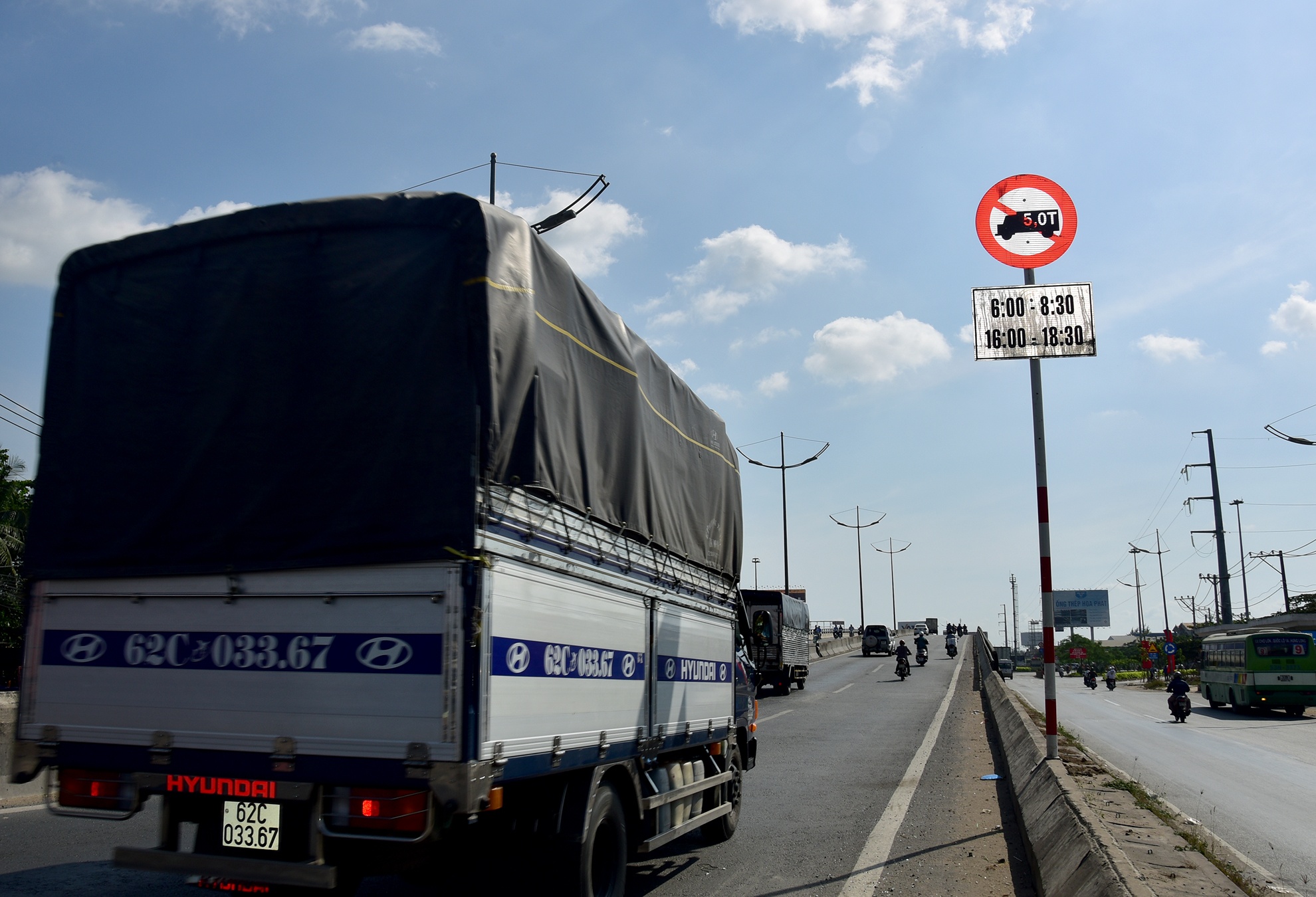 | Trên cầu vượt quốc lộ 1A (huyện Bình Chánh), hướng đi Long An, một biển báo cấm xe tải 5 tấn lưu thông lên cầu vào hai khung giờ nằm ngay tại dốc cầu. Biển báo quá nhỏ, khi tài xế xe tải chạy lên cầu mới phát hiện thì đã quá muộn. |