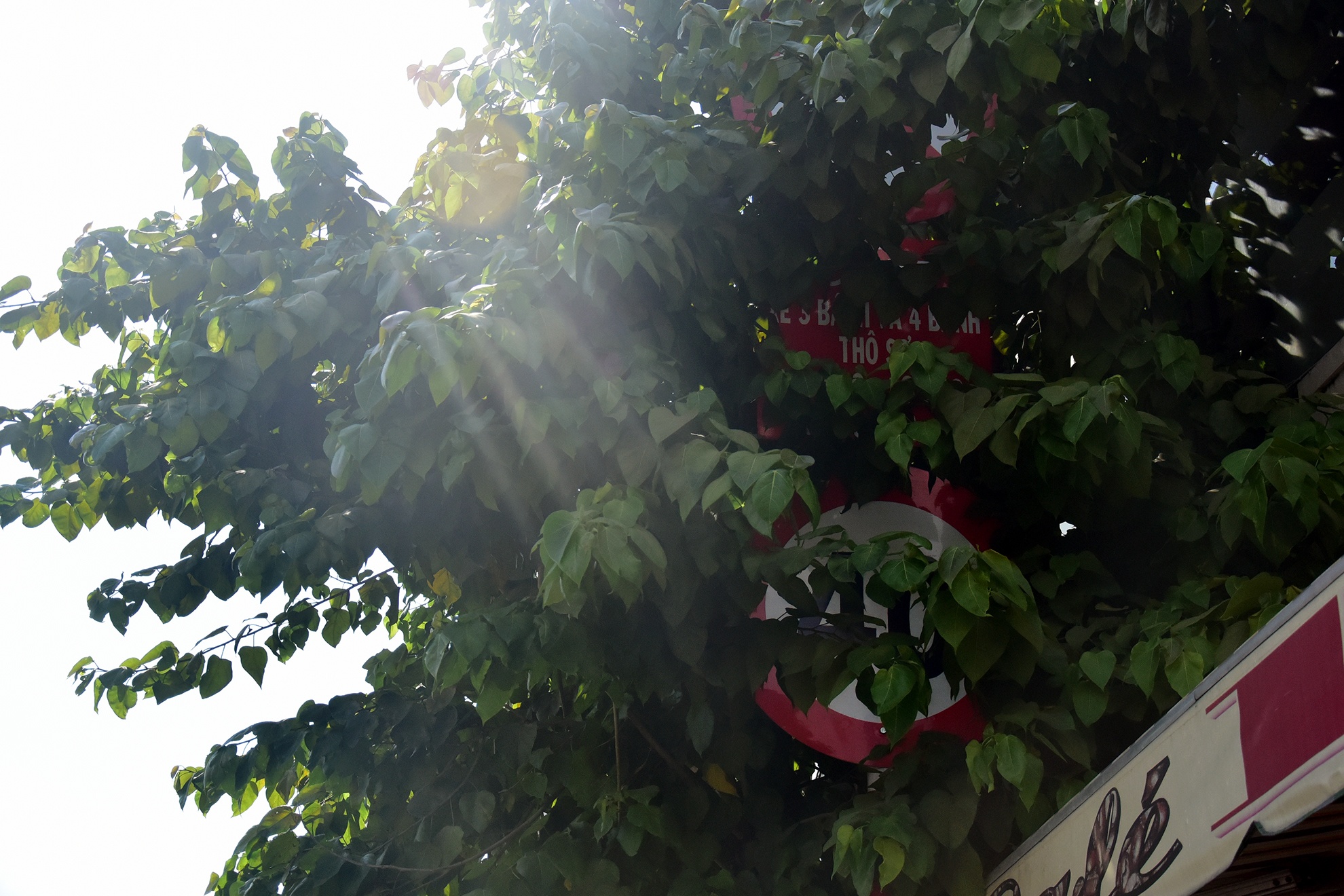 | Tương tự là tại đại lộ Võ Văn Kiệt, biển báo vừa bị cây bao phủ, vừa khuất sau mái che của một quán cà phê. |