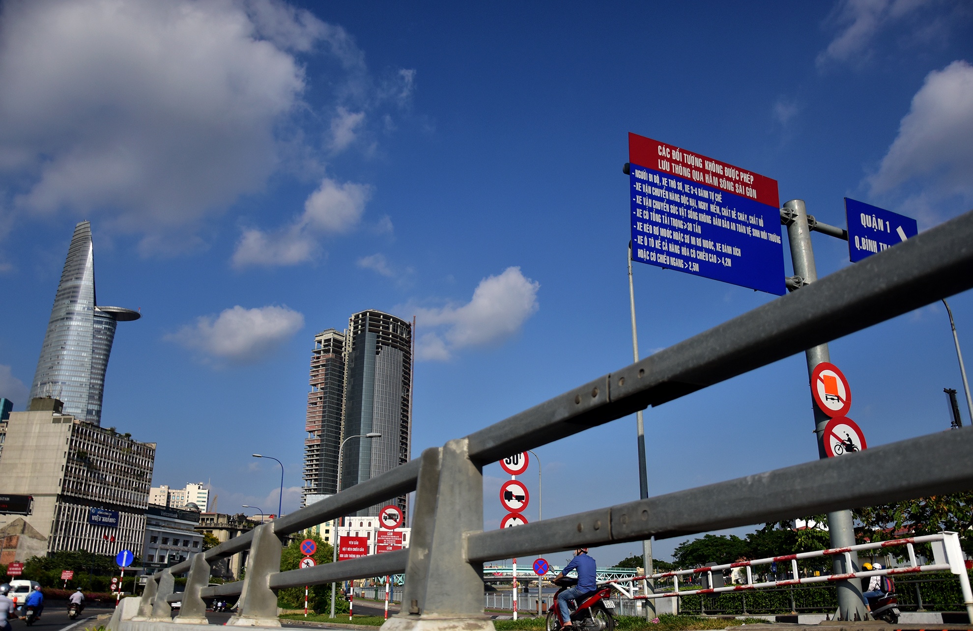 | Biển báo nhiều chữ và hàng chục biển báo khác nhau được đặt ngay sát dốc vào hầm Thủ Thiêm. Người điều khiển các phương tiện khi nhìn thấy các biển báo này cũng là lúc đang lao dốc vào hầm. |