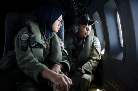 | Một máy bay của Không quân Malaysia tìm tung tích phi cơ Boeing 777 của hãng hàng không Malaysia Airlines ở eo biển Malacca hôm 15/3. Ảnh: Reuters. |