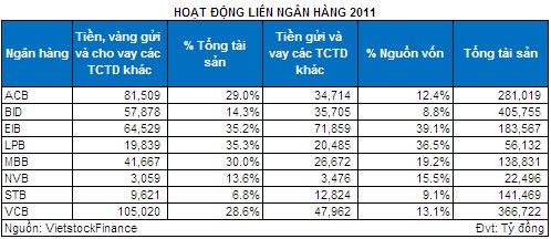Giai đoạn cuối năm 2011, hầu hết các ngân hàng vừa và nhỏ gặp khó khăn do thiếu hụt thanh khoản. Điều này đã khiến hoạt động trên thị trường liên ngân hàng nở rộ trong giai đoạn này và được thể hiện khá rõ trong báo cáo tài chính những năm 2011 - 2012. Thống kê bên dưới cho thấy các khoản mục liên ngân hàng gia tăng khá mạnh trong cơ cấu tài sản/nguồn vốn của các ngân hàng thương mại trong năm 2011.
