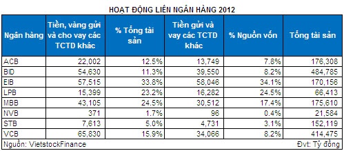 Năm 2012, tình hình huy động vốn được cải thiện trở lại vào giai đoạn cuối năm và quy mô hoạt động liên ngân hàng đã giảm nhiệt. Bên cạnh đó, việc Ngân hàng Nhà nước (NHNN) ban hành Thông tư 21/2012/TT-NHNN nhằm kiểm soát chặt chẽ hơn thị trường liên ngân hàng càng khiến cho các nghiệp vụ này trở nên trầm lắng hơn. Do đó, không quá khó hiểu khi khoản mục liên ngân hàng vào cuối năm 2012 đã giảm mạnh về quy mô lẫn tỷ trọng. Theo báo cáo tài chính của các ngân hàng thương mại, một số ngoại lệ là EIB, MBB, BID, LPB và VCB vẫn còn quy mô hoạt động liên ngân hàng khá lớn.