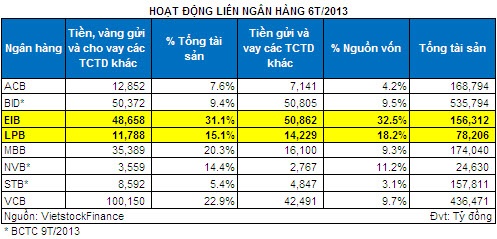 Năm 2013, hoạt động liên ngân hàng trầm lắng khi huy động vốn từ thị trường 1 vẫn được duy trì khá tích cực bất chấp lãi suất huy động sụt giảm. Tuy nhiên, một số ngân hàng vẫn tiếp tục có hoạt động liên ngân hàng cao đáng chú ý, nổi bật nhất có lẽ là EIB và LPB. Cụ thể, theo báo cáo tài chính 6T/2013 (các ngân hàng này chưa công bố báo cáo tài chính 9T/2013), khoản mục Tiền vàng gửi và cho vay các tài chính tín dụng khác của EIB và LPB chiếm tỷ lệ khá cao trong tổng tài sản, lần lượt ở mức 31,1% và 15,1%. Ở chiều ngược lại, khoản mục Tiền gửi và vay các TCTD khác chiếm tỷ lệ tương ứng 32,5% và 18,2% trong Tổng nguồn vốn của các ngân hàng này.