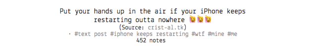 Trên trang Tumblr, "iPhone bị lỗi" đang trở thành một chủ đề hot, thu hút hàng trăm thành viên tham gia thảo luận. "Giơ tay đồng ý nếu iPhone của bạn liên tục khởi động lại mà không đưa ra cảnh báo gì" - bài đăng này trên Tumblr nhận được sự đồng thuận từ hơn 400 người, cho thấy sự trầm trọng của vấn đề.