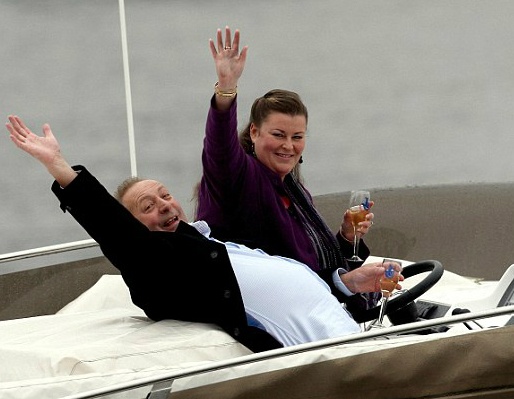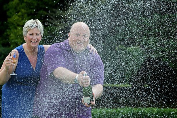 | Ông Adrian và bà Gillian phun sâm banh để mừng việc trúng giải độc đắc trị giá tới 148 triệu bảng từ 16 tháng trước. Ảnh: Mirror. |