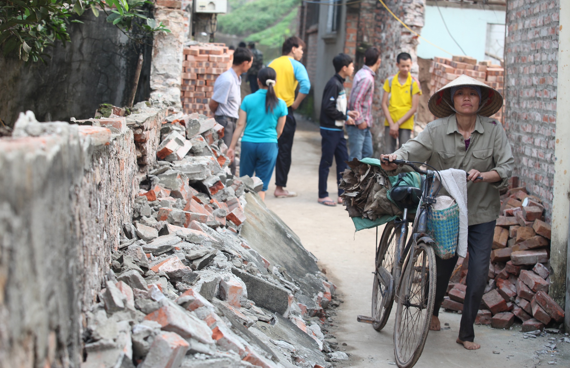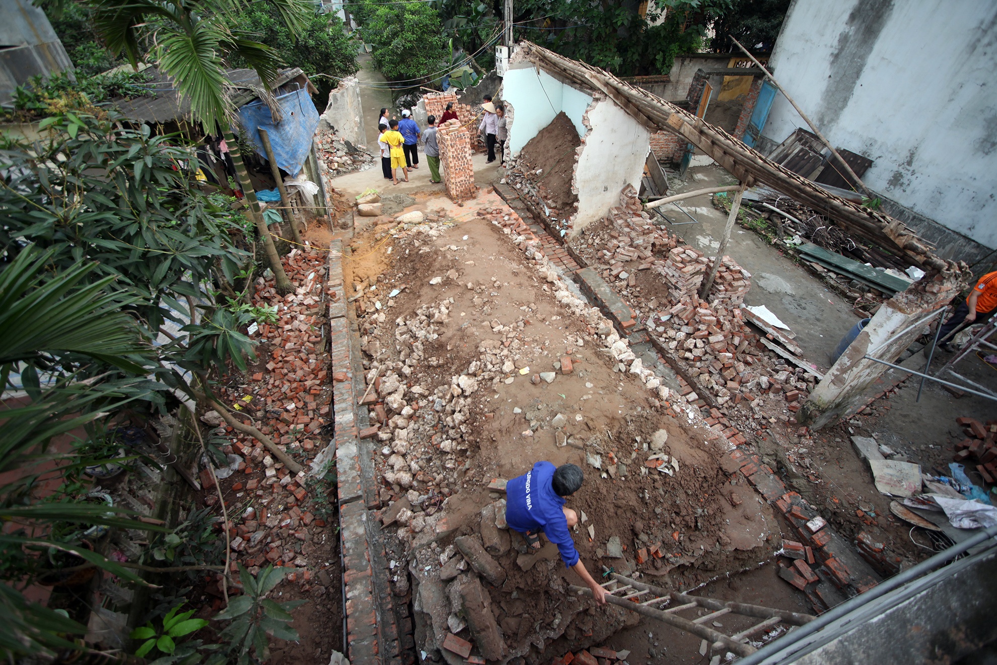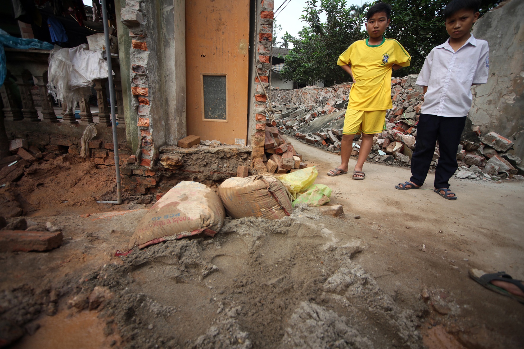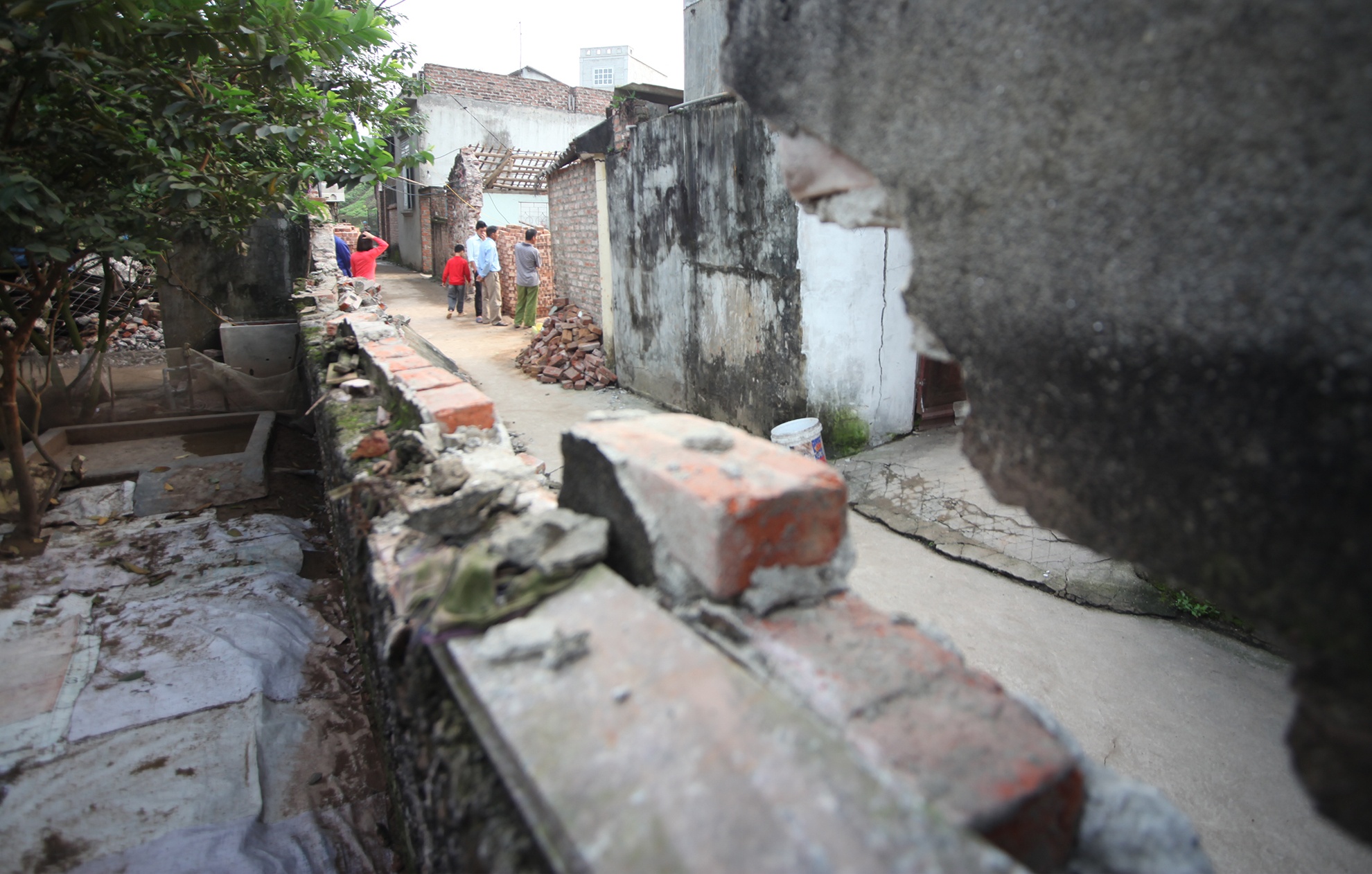 Một trong những ảnh hưởng của sự cố đó là bức tường dài 16m của hộ dân trước cửa ngôi nhà tiến hành khoan giếng đổ sụp, gạch cát lổn nhổn đường làng.