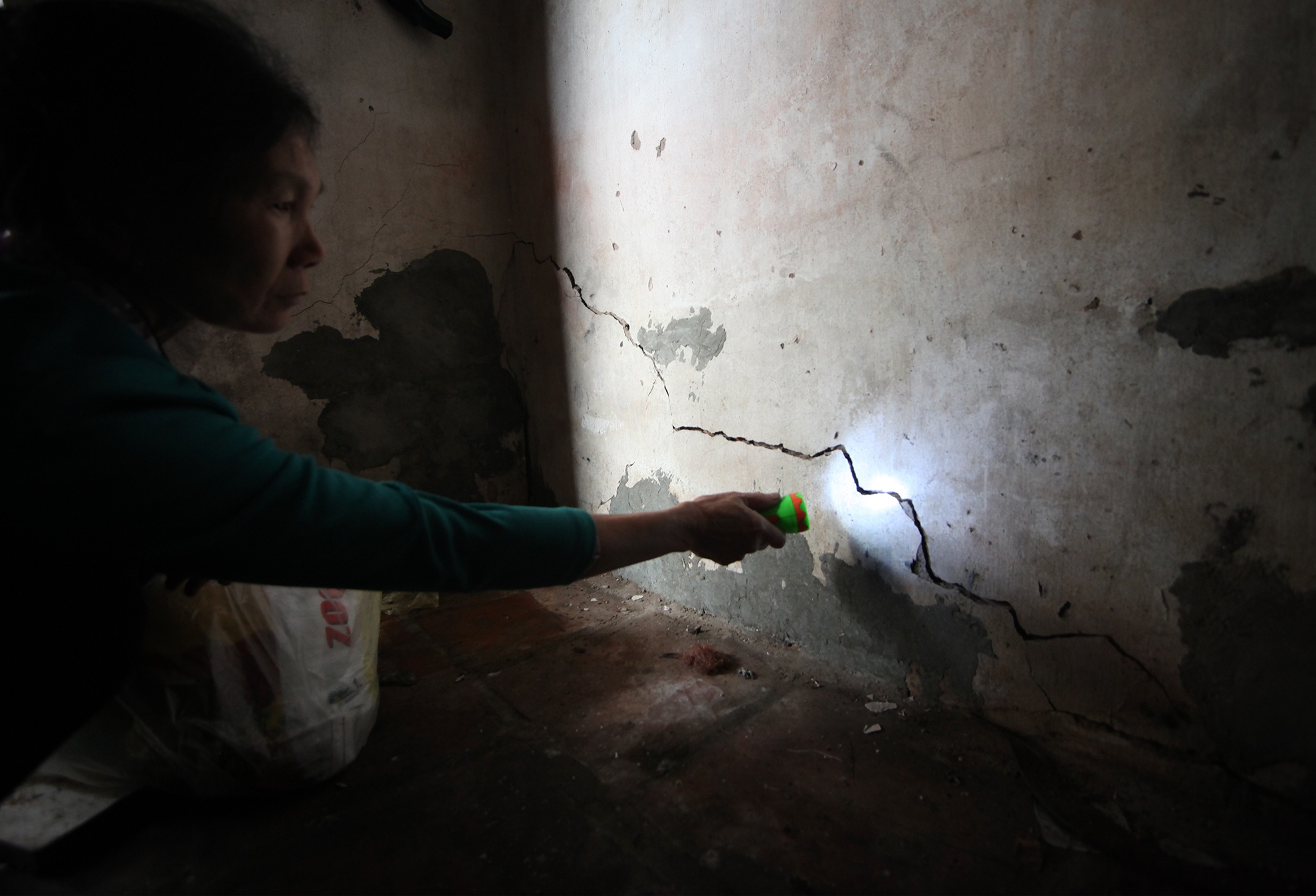 Bà Nguyễn Thị Vị soi đèn kiểm tra những vết nứt mới trong nhà mình.