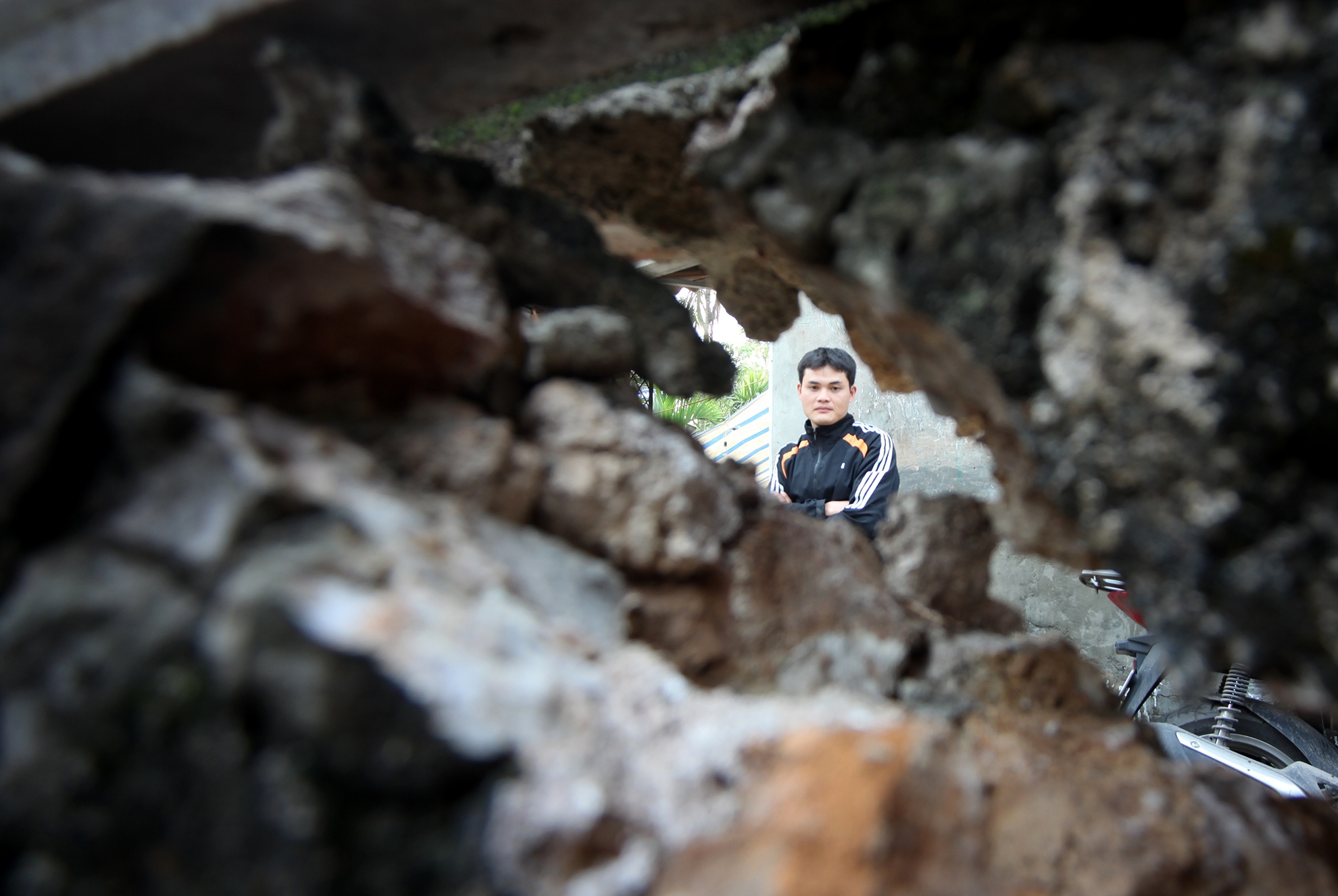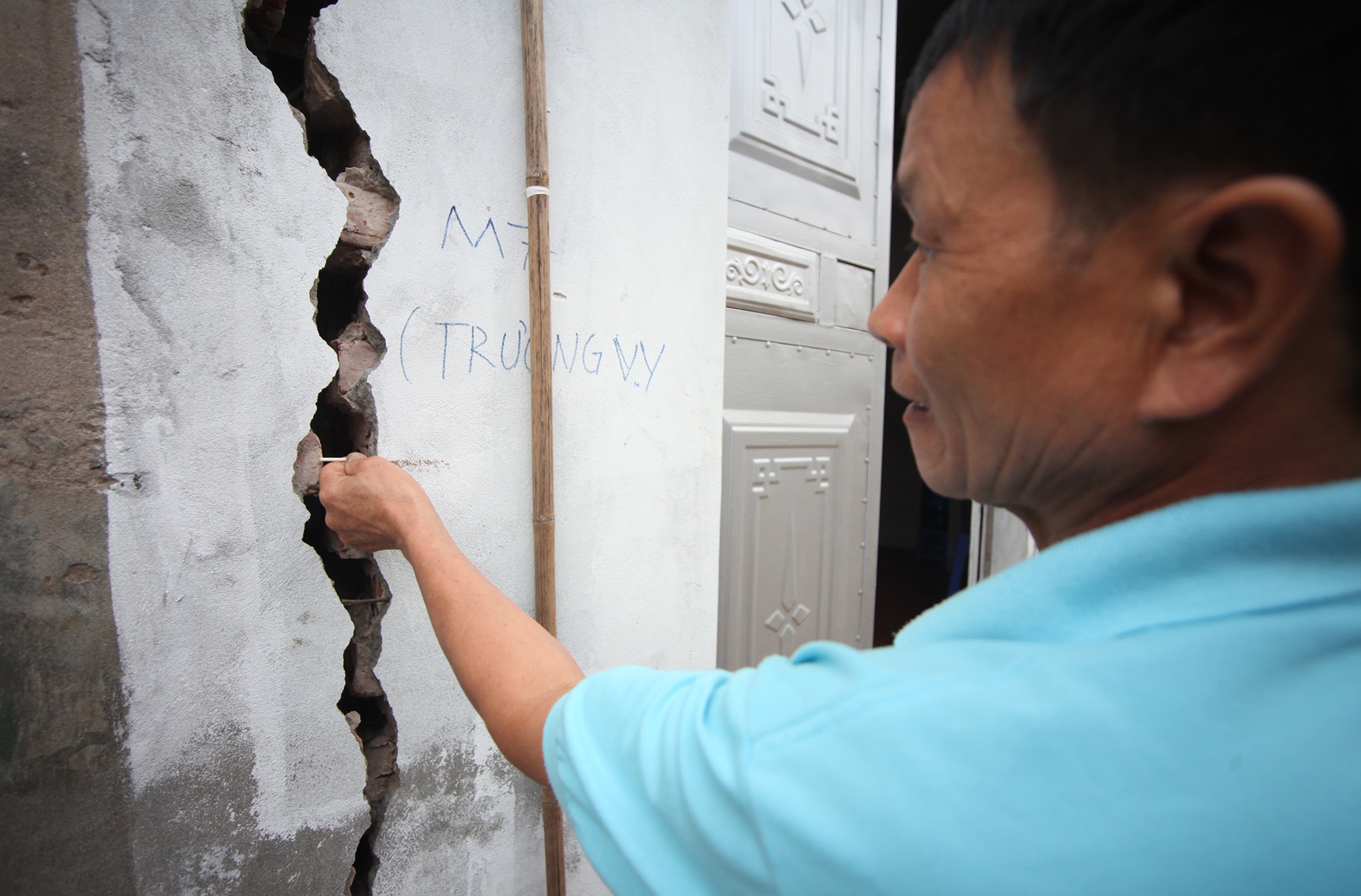 17h10 ngày 5/4 ông Minh đặt chiếc que nhỏ vào khe nứt trên bức tường để đo và theo dõi tình trạng nứt còn diễn ra tiếp sau đó hay không. Theo người dân trong làng, gia đình anh chị Cương Huyên mới mua mảnh đất trên được nửa tháng nay sau đó tiến hành xây nhà. Cùng thời điểm đó khi tiến hành khoan giếng thì có hiện tượng trên.