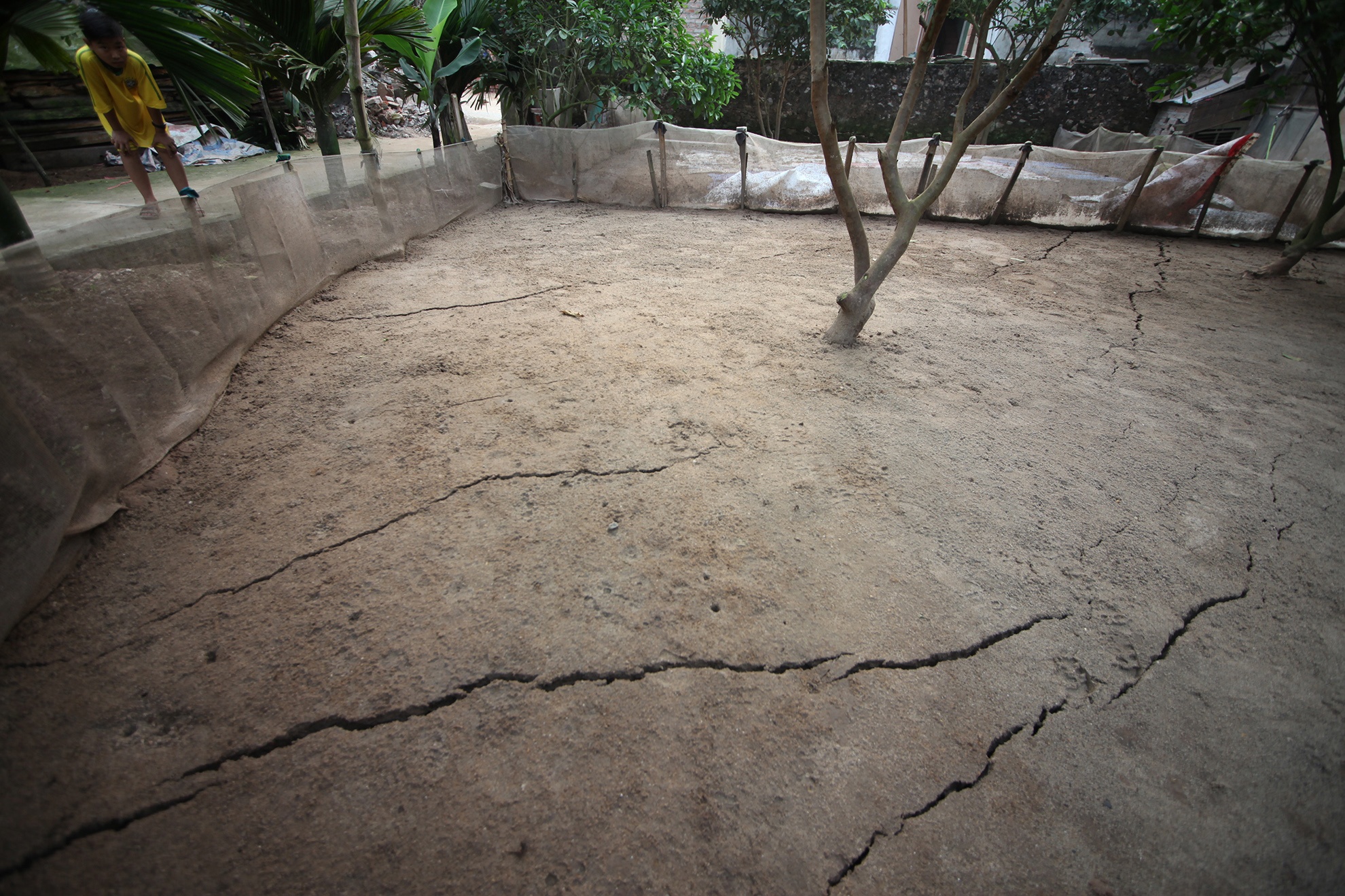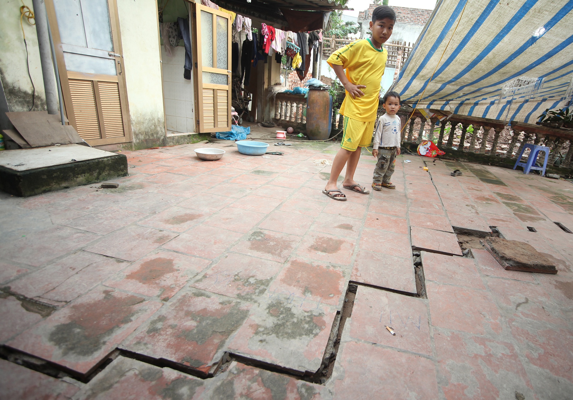 Sân nhà bà Nguyễn Thị Vị vết đứt gãy ngày càng há to. Gia đình bị ảnh hưởng nặng nề, mất điện, mất nước, tường nhà, bếp, nhà vệ sinh không còn giữ được độ an toàn, cả nhà phải di chuyển sang ở nhờ hàng xóm và người thân.