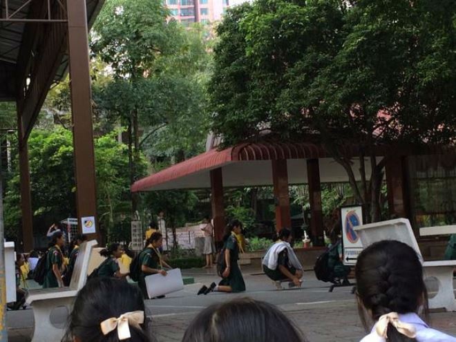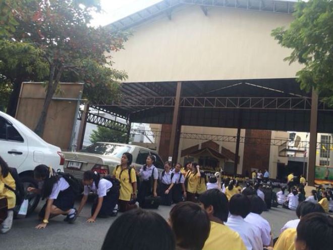Ảnh chụp các nữ sinh trường Khlong Toei bị phạt đi bằng đầu gối được chia sẻ trên mạng. |