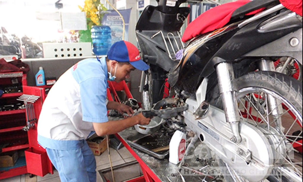 Một xe của hãng Honda bị cong xupap sau khi đổ xăng ở TP Mỹ Tho đang được sửa chữa . |